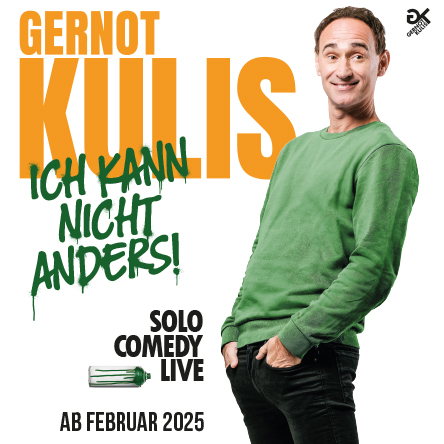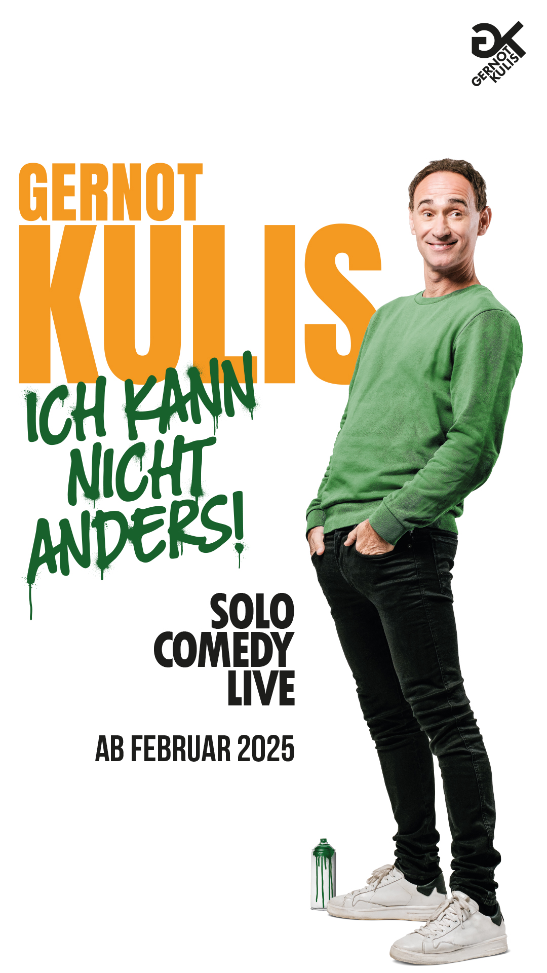 Sein Leben ist ein Gag. Der Kabarettist und Comedian unterhält Österreich seit Jahren mit Stand-Up-Comedy und ist bekannt für seine hohe Pointendichte. Seine Solo-Programme „Kulisionen“, „Herkulis“ und „Hold the Line – Best of Callboy“ – sorgten für ausverkaufte Häuser. Die Geschichten aus seinem schrägen Leben, sowie die tagesaktuellen Themen, die er mit viel Tempo serviert und immer neu variiert, machen seine Live-Shows zum unvergesslichen Erlebnis. Neben der Bühne ist Gernot Kulis bekannt als Stimmenimitator: Als „Karl Schmähhammer“ hat er zehntausende Klicks auf Social Media. Seit Februar 2025 ist der Comedian mit seiner vierten Live-Show „Ich kann nicht anders“ auf Österreichtour!